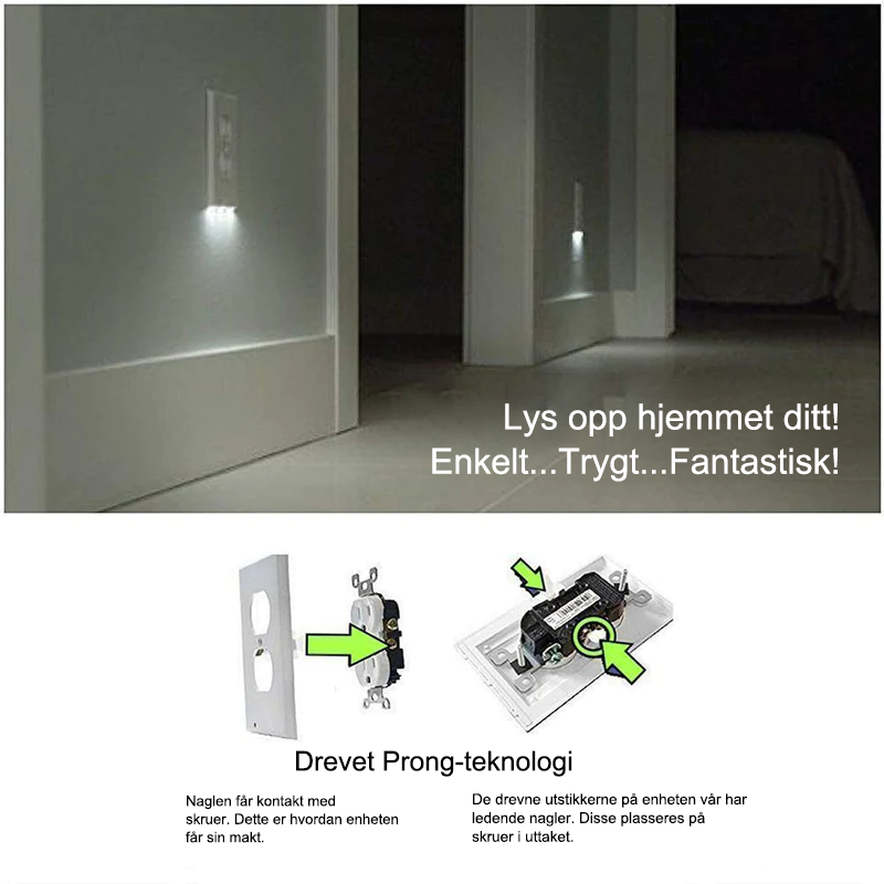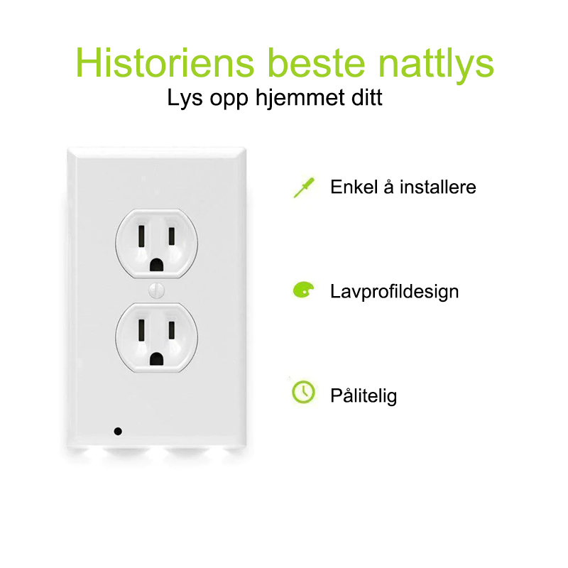 Vår uttaksveggplate med LED-nattlys er flott for folk som har barn og folk som har en tendens til å stå opp mye om natten. Perfekt for å lyse opp området for å forhindre at du støter på møbler eller vegger!