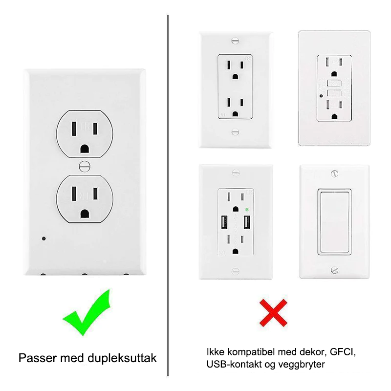 • Ikke kompatibel med GFCI-uttak, dekor, USB-kontakt og veggbryter!