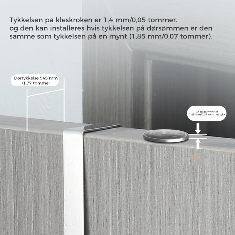 • 【Passer for de fleste dører】 For den beste opplevelsen bør du måle dørstørrelsen din før du kjøper. Dørhengeren passer til døren fra 1 tomme til 1,6 tommer tykk, og sørg for at avstanden mellom døren og karmen er større enn 0,078 tommer (én nikkel tykkelse) for å gjøre døren kan lukkes.